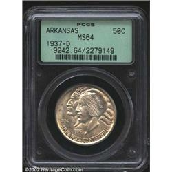 1937-D 50C Arkansas MS64 PCGS. Brilliant except for a few sprinkles of russet toning around the obverse periphery. Important notice: We expect to be auctioning lots at the rate of 200-250 per hour. Sometimes eBay Premier live bid software cannot keep up with that pace, so we strongly recommend that you place a realistic proxy bid now as insurance to avoid disappointment. Also please note that all Heritage/CAA lots purchased through eBay Premier carry a 20% Buyer's Premium.