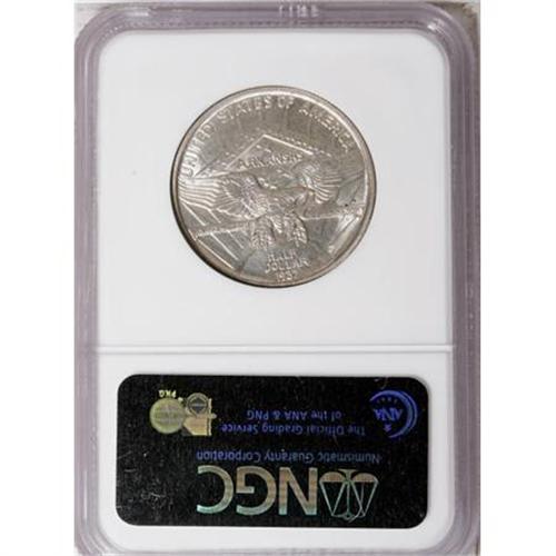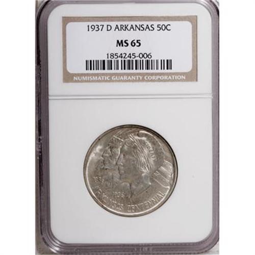 <B>1937-D 50C Arkansas MS65 NGC.</B></I> NGC Census: (268/83). PCGS Population (317/122). Mintage: 5,505. Numismedia Wsl. Price for NGC/PCGS coin in MS65: $276. (#9242)<BR><I>From The Frank DuVall Collection of U.S. Commemoratives.</B></I><BR><BR><b>Shipping:</b> Coins & Currency (<a target="_blank" href="http://www.heritageauctions.com/common/shipping.php">view shipping information</a>\)