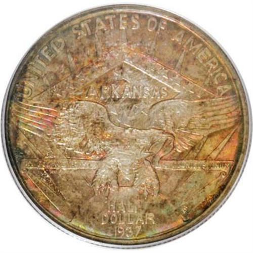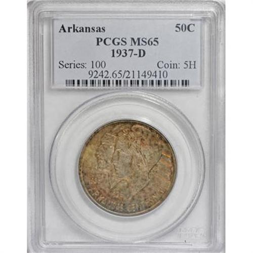 <B>1937-D 50C Arkansas MS65 PCGS.</B></I> PCGS Population (317/122). NGC Census: (267/83). Mintage: 5,505. Numismedia Wsl. Price for NGC/PCGS coin in MS65: $276. (#9242)<BR><BR><b>Shipping:</b> Coins & Currency (<a target="_blank" href="http://www.heritageauctions.com/common/shipping.php">view shipping information</a>\)