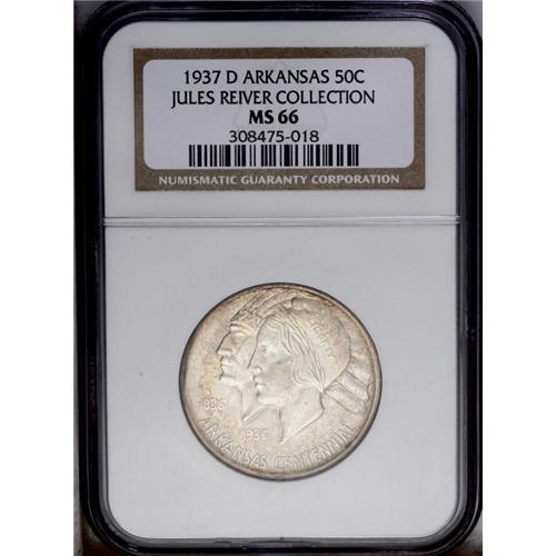 1937-D 50C Arkansas MS66 NGC. A satiny, nearly flawles 1937-D[50C] Arkansas MS66 NGC.