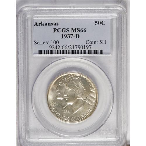 <B>1937-D 50C Arkansas MS66 PCGS.</B></I> A highly lustrous Premium Gem, one of just 5,505 pieces coined, that has pretty luster. Delicate rose toning graces the upper obverse.<BR><BR><b>Shipping:</b> Coin/Currency (<a target="_blank" href="http://www.heritageauctions.com/common/shipping.php">view shipping information</a>)