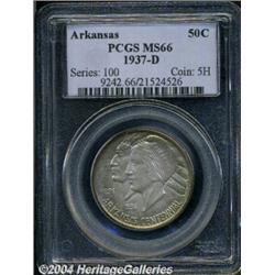 <B>1937-D<50C> Arkansas MS66 PCGS.</B></I> Bright and lustrous with pale golden-olive toning around the obverse periphery. <BR><BR><B>Important notice:</B> Heritage usually auctions material at the rate of 200-250 lots per hour. On some occasions eBay Live bid software or the Internet may not be able to keep up with the pace of the auction. We recommend placing a realistic absentee bid now as insurance to avoid disappointment. Occasionally the auctioneer may eliminate or reject an eBay Live bid, and the auctioneer may also reopen a lot after the close of the eBay live bidding (usually because we missed an audience bid), and may reject your bid even if it shows you as the winning bidder. By bidding via eBay Live, you agree that Heritage may award the lot to another bidder at its sole discretion under the circumstances described above or any other reasonable circumstances. Since eBay bids are not shown to us until we open the lot on the floor, we treat those bids just like floor bids. In most cases the floor responds before the eBay bid is presented to us, due to Internet lag time, so for consistency we have made it a policy that floor bids are always considered first over tie eBay live bids. Also please note that all Heritage lots purchased through eBay Live carry a 20% Buyer's Premium. Please make sure you read the Terms and Conditions before you bid.