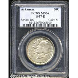 <B>1937-D<50C> Arkansas MS66 PCGS.</B></I> The otherwise soft, pearl-gray patina yields to richer orange-russet shading around much of the obverse border. Smooth, satiny, and boldly impressed. <BR><BR><B>Important notice:</B> Heritage usually auctions material at the rate of 200-250 lots per hour. On some occasions eBay Live bid software or the Internet may not be able to keep up with the pace of the auction. We recommend placing a realistic absentee bid now as insurance to avoid disappointment. Occasionally the auctioneer may eliminate or reject an eBay Live bid, and the auctioneer may also reopen a lot after the close of the eBay live bidding (usually because we missed an audience bid), and may reject your bid even if it shows you as the winning bidder. By bidding via eBay Live, you agree that Heritage may award the lot to another bidder at its sole discretion under the circumstances described above or any other reasonable circumstances. Since eBay bids are not shown to us until we open the lot on the floor, we treat those bids just like floor bids. In most cases the floor responds before the eBay bid is presented to us, due to Internet lag time, so for consistency we have made it a policy that floor bids are always considered first over tie eBay live bids. Also please note that all Heritage lots purchased through eBay Live carry a 20% Buyer's Premium. Please make sure you read the Terms and Conditions before you bid.