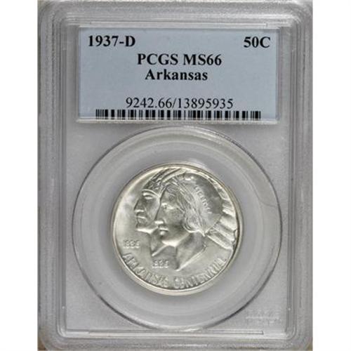 <B>1937-D 50C Arkansas MS66 PCGS.</B></I> Bright, radiantly surfaces are color free, and display sharply struck design elements. We mention a few light marks on the obverse portraits for complete accuracy.<BR><BR><b>Shipping:</b> Coins & Currency (<a target="_blank" href="http://www.heritageauctions.com/common/shipping.php">view shipping information</a>)