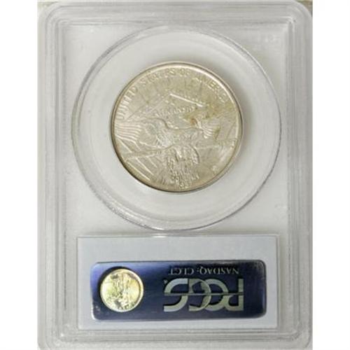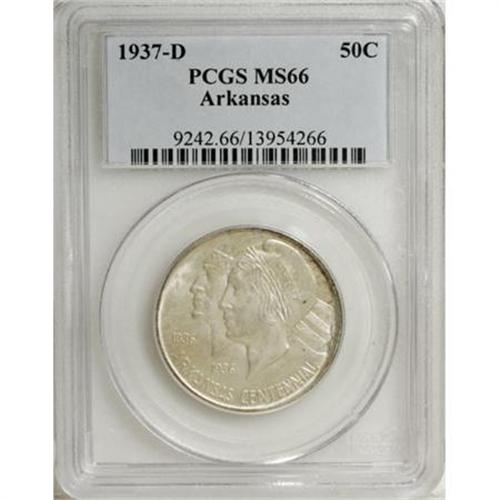 <B>1937-D 50C Arkansas MS66 PCGS.</B></I> The surfaces of this softly lustrous Premium Gem are predominantly silver-gray with small dots of charcoal at the right obverse. Well-defined for the series and one of just 5,505 pieces struck. PCGS has graded just 15 coins finer (9/07).<BR><BR><b>Shipping:</b> Coins & Currency (<a target="_blank" href="http://www.heritageauctions.com/common/shipping.php">view shipping information</a>)