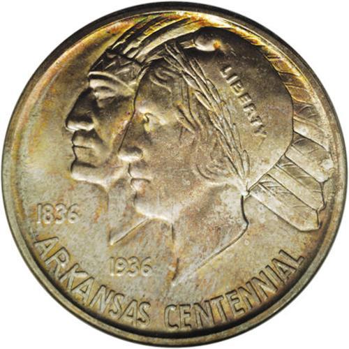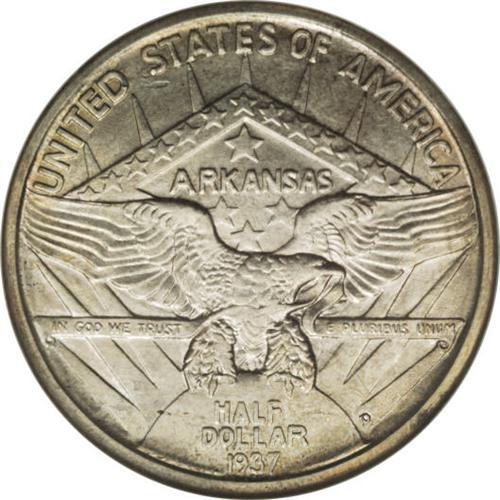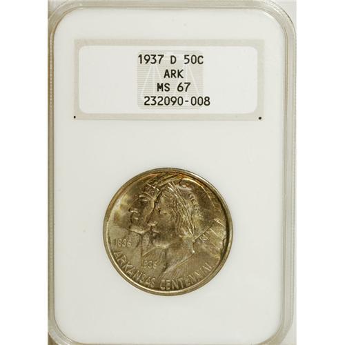 <B>1937-D 50C Arkansas MS67 NGC.</B></I> A shimmering, nearly flawless example that derives from an issue of only 5,505 pieces. Both sides display light, yet distinct gold-orange and lavender-gray patina. Challenging in this grade and nearly unmatched with such strong eye appeal. NGC has graded just seven coins in MS67, none of which received the Star designation (3/07).<BR><I>From The Cary & Cheryl Porter Collection.</B></I><BR><BR><b>Shipping:</b> Coins & Currency (<a target="_blank" href="http://www.heritageauctions.com/common/shipping.php">view shipping information</a>)