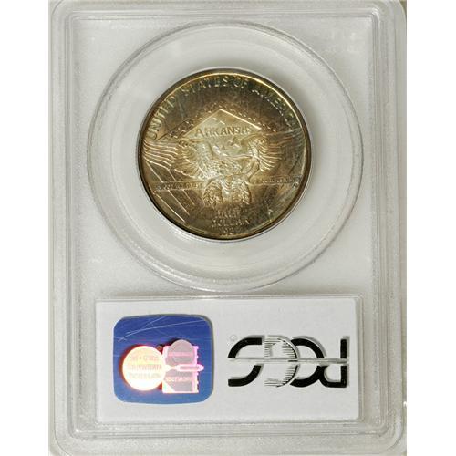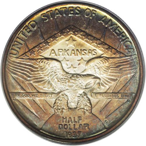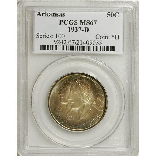 <B>1937-D 50C Arkansas MS67 PCGS.</B></I> Though Glenna Goodacre was the first woman to create a non-commemorative circulation-strike design, the Sacagawea dollar obverse of 2000, various commemorative coins issued by the United States have designs envisioned or modeled by female artists, gifted individuals such as Laura Gardin Fraser, Gertrude K. Lathrop, and Elizabeth Jones. This exquisitely preserved 1937-D Arkansas half reflects the special touch of yet another sculptress, native daughter Emily Bates. Bands of cerulean, plum, and reddish-orange surround small, brilliant centers. PCGS has graded only one coin finer (3/07).<BR><I>From The Cary & Cheryl Porter Collection.</B></I><BR><BR><b>Shipping:</b> Coins & Currency (<a target="_blank" href="http://www.heritageauctions.com/common/shipping.php">view shipping information</a>)