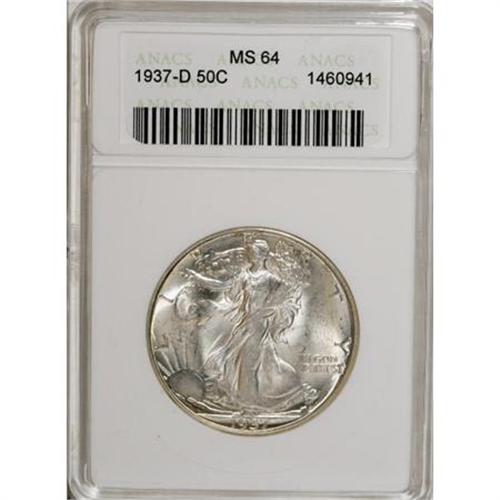 <B>1937-D 50C MS64 ANACS.</B></I> . NGC Census: (296/459). PCGS Population (575/969). Mintage: 1,676,000. Numismedia Wsl. Price for NGC/PCGS coin in MS64: $260. (#6602)<BR><BR><B>Coin Engraver:</B> Adolph A. Weinman<BR><BR><b>Shipping:</b> Coins & Currency (<a target="_blank" href="http://www.heritageauctions.com/common/shipping.php">view shipping information</a>)