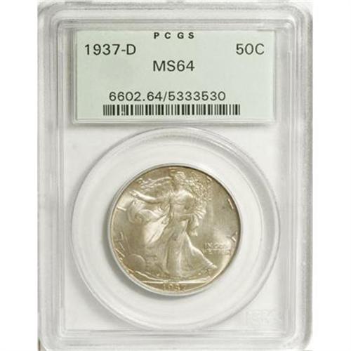 <B>1937-D 50C MS64 PCGS.</B></I> PCGS Population (563/953). NGC Census: (291/451). Mintage: 1,676,000. Numismedia Wsl. Price for NGC/PCGS coin in MS64: $204. (#6602)<BR><BR><B>Coin Engraver:</B> Adolph A. Weinman<BR><BR><b>Shipping:</b> Coins & Currency (<a target="_blank" href="http://www.heritageauctions.com/common/shipping.php">view shipping information</a>)