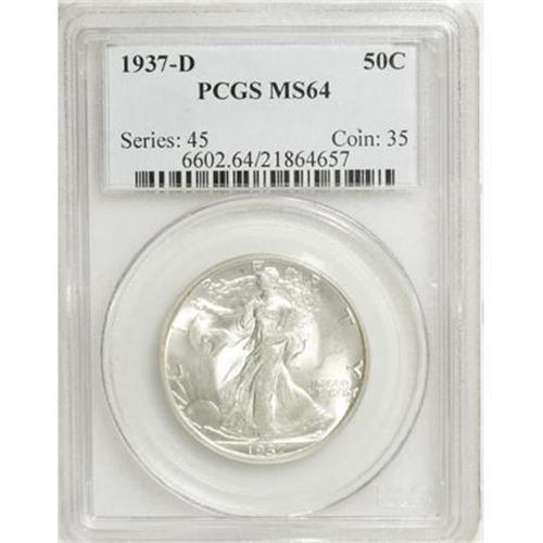 <B>1937-D 50C MS64 PCGS.</B></I> PCGS Population (564/964). NGC Census: (291/451). Mintage: 1,676,000. Numismedia Wsl. Price for NGC/PCGS coin in MS64: $204. (#6602)<BR><BR><B>Coin Engraver:</B> Adolph A. Weinman<BR><BR><b>Shipping:</b> Coins & Currency (<a target="_blank" href="http://www.heritageauctions.com/common/shipping.php">view shipping information</a>)