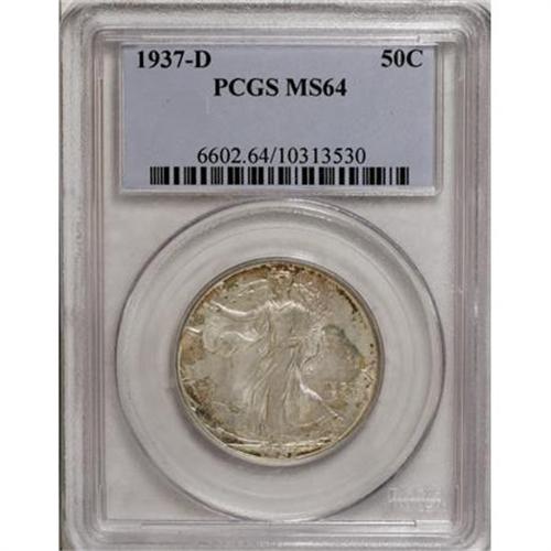 <B>1937-D 50C MS64 PCGS.</B></I> . PCGS Population (575/969). NGC Census: (296/459). Mintage: 1,676,000. Numismedia Wsl. Price for NGC/PCGS coin in MS64: $260. (#6602)<BR><BR><B>Coin Engraver:</B> Adolph A. Weinman<BR><BR><b>Shipping:</b> Coins & Currency (<a target="_blank" href="http://www.heritageauctions.com/common/shipping.php">view shipping information</a>)