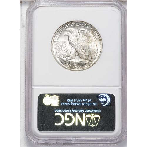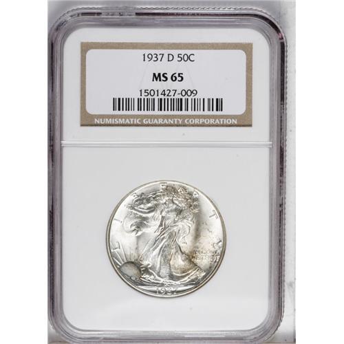 <B>1937-D<50C> MS65 NGC.</B></I> Spots of tan, golden-brown, and violet patina appear on each side. This pleasing Gem has well-defined devices, as well as frosty luster.