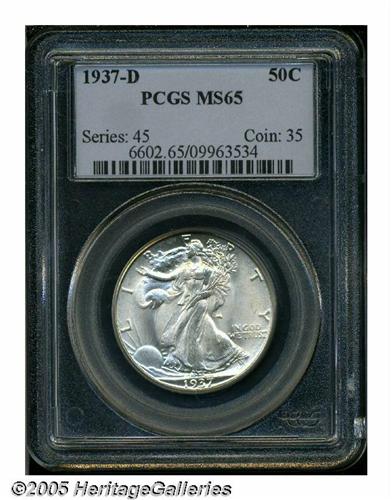 <B>1937-D<50C> MS65 PCGS.</B></I> Bright and nearly white with surfaces that are unquestionably of Gem quality. The design elements are exquisitely struck up.