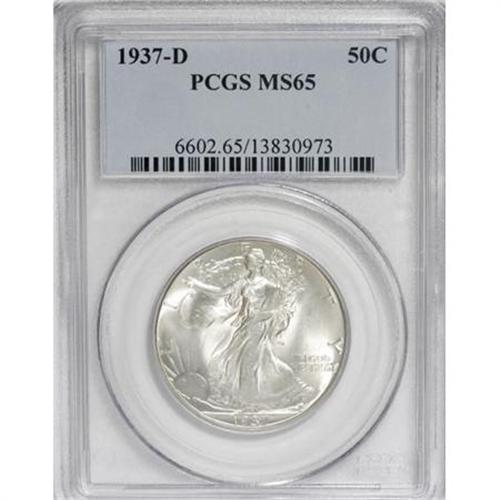 <B>1937-D 50C MS65 PCGS.</B></I> PCGS Population (629/316). NGC Census: (298/148). Mintage: 1,676,000. Numismedia Wsl. Price for NGC/PCGS coin in MS65: $800. (#6602)<BR><BR><B>Coin Engraver:</B> Adolph A. Weinman<BR><BR><b>Shipping:</b> Coins & Currency (<a target="_blank" href="http://www.heritageauctions.com/common/shipping.php">view shipping information</a>\)