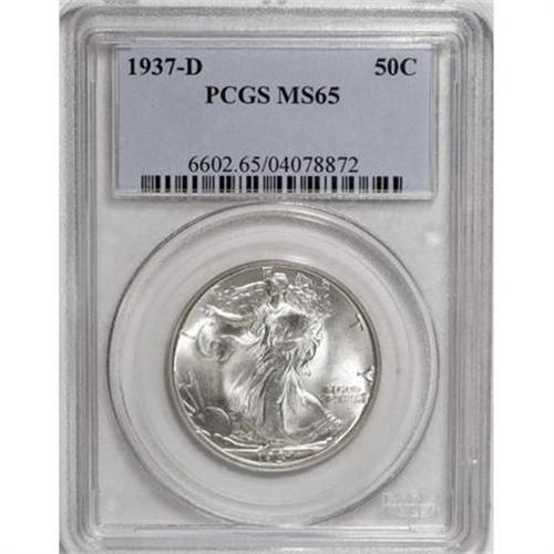 <B>1937-D 50C MS65 PCGS.</B></I> PCGS Population (640/326). NGC Census: (302/155). Mintage: 1,676,000. Numismedia Wsl. Price for NGC/PCGS coin in MS65: $775. (#6602)<BR><BR><B>Coin Engraver:</B> Adolph A. Weinman<BR><BR><b>Shipping:</b> Coins & Currency (<a target="_blank" href="http://www.heritageauctions.com/common/shipping.php">view shipping information</a>)