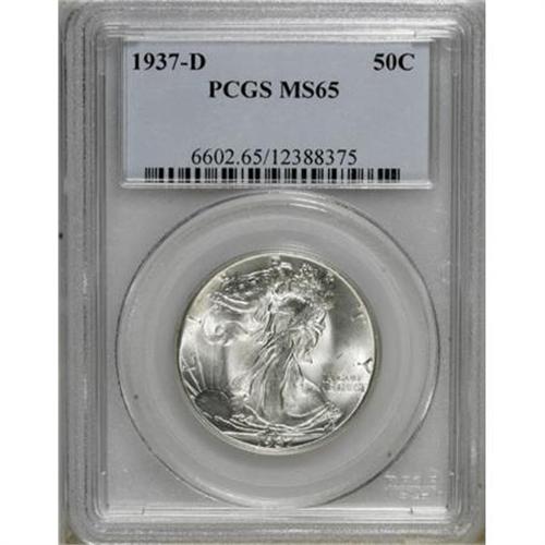 <B>1937-D 50C MS65 PCGS.</B></I> PCGS Population (646/333). NGC Census: (303/156). Mintage: 1,676,000. Numismedia Wsl. Price for NGC/PCGS coin in MS65: $785. (#6602)<BR><BR><B>Coin Engraver:</B> Adolph A. Weinman<BR><BR><b>Shipping:</b> Coins & Currency (<a target="_blank" href="http://www.heritageauctions.com/common/shipping.php">view shipping information</a>)