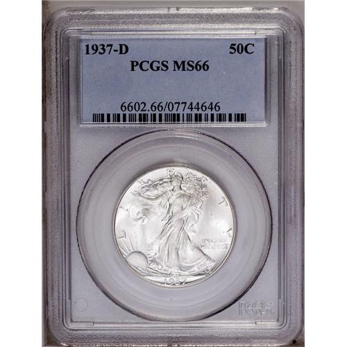 <B>1937-D<50C> MS66 PCGS.</B></I> A captivating, fully brilliant example with boldly struck features and faintly striated fields. It would be difficult to improve upon the eye appeal of this solid Premium Gem. <BR><BR><B>Important notice:</B> Heritage usually auctions material at the rate of 200-250 lots per hour. On some occasions eBay Live bid software or the Internet may not be able to keep up with the pace of the auction. We recommend placing a realistic absentee bid now as insurance to avoid disappointment. Occasionally the auctioneer may eliminate or reject an eBay Live bid, and the auctioneer may also reopen a lot after the close of the eBay live bidding (usually because we missed an audience bid), and may reject your bid even if it shows you as the winning bidder. By bidding via eBay Live, you agree that Heritage may award the lot to another bidder at its sole discretion under the circumstances described above or any other reasonable circumstances. Since eBay bids are not shown to us until we open the lot on the floor, we treat those bids just like floor bids. In most cases the floor responds before the eBay bid is presented to us, due to Internet lag time, so for consistency we have made it a policy that floor bids are always considered first over tie eBay live bids. Also please note that all Heritage lots purchased through eBay Live carry a 20% Buyer's Premium. Please make sure you read the Terms and Conditions before you bid. This lot is being auctioned in conjunction with a live floor auction by Heritage Galleries & Auctioneers. All final auction and invoice information will be supplied by Heritage Galleries & Auctioneers, and all other information should be considered preliminary. Lot:2962 <BR><BR><B>Winning Notification and Billing:</B> After the FINAL session in this auction is complete, Heritage will send e-mail and snail mail invoices. This process normally takes several days. All final auction and invoice information will be supplied by Heritage Galleries & Auctioneers, and all other information should be considered preliminary. <BR><BR>This auction will be conducted on a live auction floor and over the Internet through eBay Live. If you choose to place an absentee bid, please take a moment to <font color='#0000ff'><u><a href='http://pages.ebay.com/liveauctions/help/before/laabsentee.html'>learn how eBay Live absentee bidding works</a></u></font><font color='#000000'>