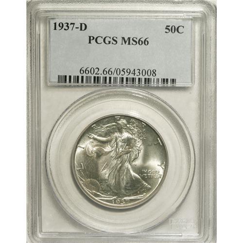 <B>1937-D 50C MS66 PCGS.</B></I> Fully struck on the obverse with lovely mint frost and untoned surfaces. A premium example of this scarcer issue from the 1930s.<BR><BR><b>Shipping:</b> Coins & Currency (<a target="_blank" href="http://www.heritageauctions.com/common/shipping.php">view shipping information</a>)