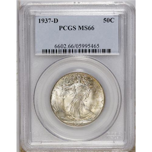 <B>1937-D 50C MS66 PCGS.</B></I> Russet and olive-green speckles run over radiantly lustrous surfaces. Sharply struck, including partial definition on the thumb. A couple of minor marks on Liberty's upper left leg are mentioned for accuracy.<BR><BR><b>Shipping:</b> Coin/Currency (<a target="_blank" href="http://www.heritageauctions.com/common/shipping.php">view shipping information</a>)