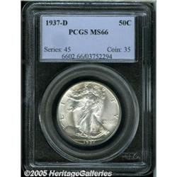 <B>1937-D 50C MS66 PCGS.</B></I> Slightly weak on Liberty's hand, but this lovely premium Gem also displays glistening, brilliant, silver-white surfaces that seem to possess a pleasing combination of satiny and frosty luster characteristics. There are a few faint striations (as struck) in the right obverse field, while a handful of tiny contact marks are divided between obverse and reverse. Population: 226 in 66, 33 finer (2/05).