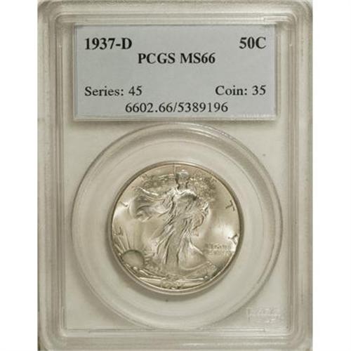 <B>1937-D 50C MS66 PCGS.</B></I> With a mintage of under 1.7 million pieces, Denver had the lowest production of half dollars for the year. This well struck and frosty Premium Gem offers outstanding visual appeal. A few touches of peach color grace the fields, but the surfaces are untoned otherwise. <BR><I>From The Vanek Collection.</B></I><BR><BR><b>Shipping:</b> Coins & Currency (<a target="_blank" href="http://www.heritageauctions.com/common/shipping.php">view shipping information</a>)