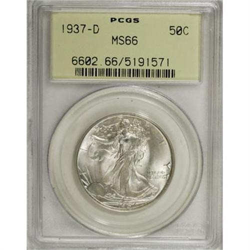 <B>1937-D 50C MS66 PCGS.</B></I> This precisely struck high grade Walker has dazzling luster and pastel sky-blue and almond-gold toning. Encased in an old green label holder.<BR><BR><B>Coin Engraver:</B> Adolph A. Weinman<BR><BR><b>Shipping:</b> Coins & Currency (<a target="_blank" href="http://www.heritageauctions.com/common/shipping.php">view shipping information</a>)