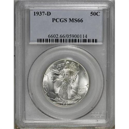 <B>1937-D 50C MS66 PCGS.</B></I> Occasional hints of gold and silver-blue patina visit the otherwise silver-white surfaces of this attractive D-mint Premium Gem. Carefully preserved with slightly above-average definition for the issue.<BR><BR><B>Coin Engraver:</B> Adolph A. Weinman<BR><BR><b>Shipping:</b> Coins & Currency (<a target="_blank" href="http://www.heritageauctions.com/common/shipping.php">view shipping information</a>)