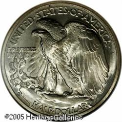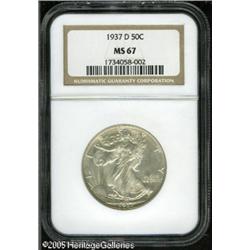 <B>1937-D 50C MS67 NGC.</B></I> Nearly flawless silver-gray surfaces are boldly detailed in nearly all areas and exhibit a plethora of wispy die striations on the right side of the obverse. Oddly enough, the 1937-D appears to be scarcer than its more famous D-mint counterpart from the following year in Gem and better condition (at least that is what the census data says). Population: 22 in 67, 1 finer (1/05). Lot:8056