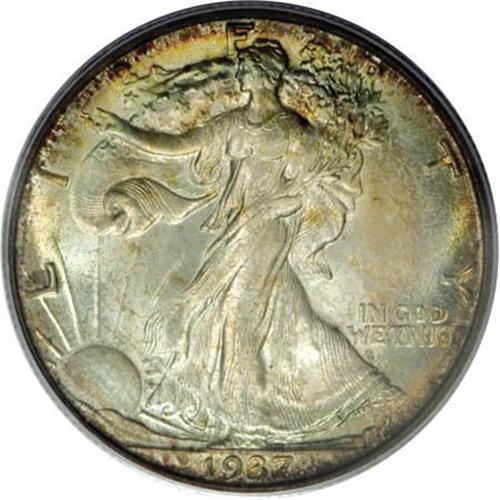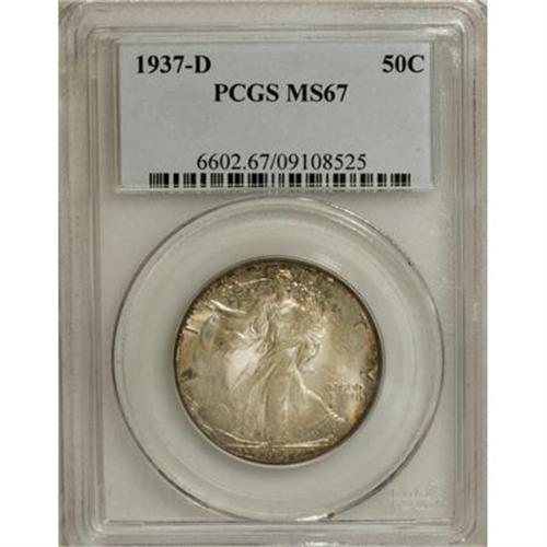 <B>1937-D 50C MS67 PCGS.</B></I> Both sides of the peerless, well frosted example are framed in lovely mint-green and russet toning. For those who strive to acquire the ultimate combination of quality and originality, this Superb example represents the quintessential 1937-D Walker. Population: 35 in 67, 0 finer (7/07).<BR><BR><B>Coin Engraver:</B> Adolph A. Weinman<BR><BR><b>Shipping:</b> Coins & Currency (<a target="_blank" href="http://www.heritageauctions.com/common/shipping.php">view shipping information</a>\)