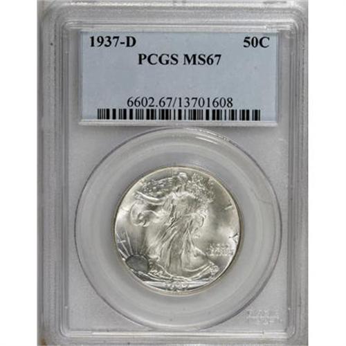 <B>1937-D 50C MS67 PCGS.</B></I> Delicate tawny-gold and sky-blue visit this virtually immaculate Superb Gem. Liberty's head and skirt lines exhibit exemplary details. Seldom seen in such quality. A lower mintage issue underrated relative to the popular 1938-D. Population: 36 in 67, 0 finer (8/07).<BR><BR><B>Coin Engraver:</B> Adolph A. Weinman<BR><BR><b>Shipping:</b> Coins & Currency (<a target="_blank" href="http://www.heritageauctions.com/common/shipping.php">view shipping information</a>)