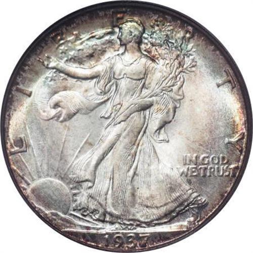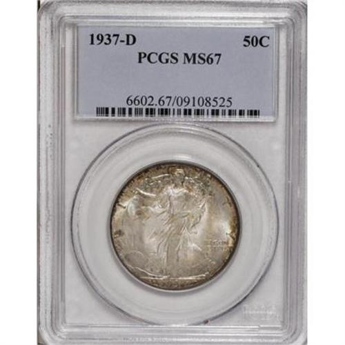 <B>1937-D 50C MS67 PCGS.</B></I> Both sides of this peerless, well frosted example are framed in lovely mint-green and russet toning. For those who strive to acquire the ultimate combination of quality and originality, this Superb example represents the quintessential 1937-D Walker. Population: 36 in 67, 0 finer (12/07). <BR><BR><B>Coin Engraver:</B> Adolph A. Weinman<BR><BR><b>Shipping:</b> Coins & Currency (<a target="_blank" href="http://www.heritageauctions.com/common/shipping.php">view shipping information</a>)