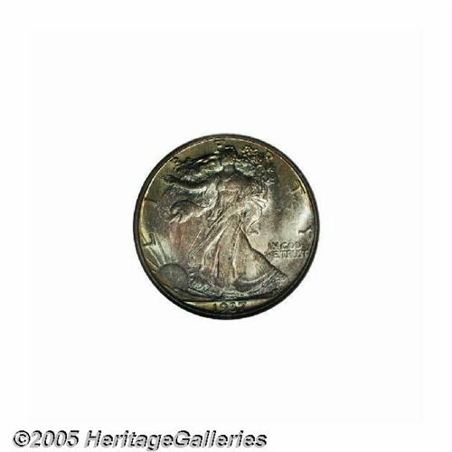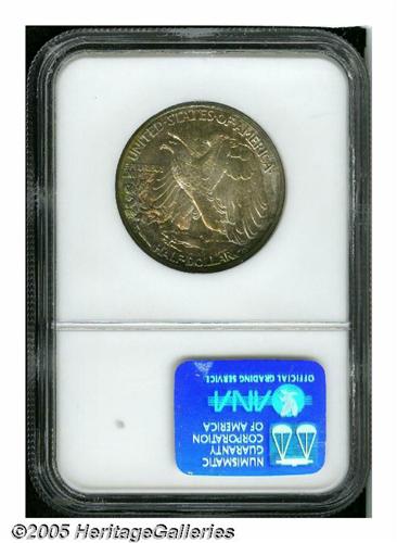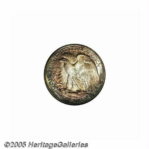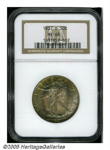 <B>1937-D<50C> MS68 NGC.</B></I> Many specialists consider this issue to be one of the toughest dates in the entire 1934 to 1947 span, despite higher values for a few other issues. Considering all grades, only the 1934-S, 1935-D, and 1935-S issues have lower total NGC populations. For the connoisseur, it is important to realize that only 94 Walking Liberty Half Dollars have been graded finer than MS67 by NGC. This remarkable coin is truly a wonder to behold. Both sides are beautifully toned in mottled powder-blue and champagne-apricot shades that are partially ringed by golden-green peripheral shadings. The strike is well above average for this often poorly impressed D-mint issue, and one would be hard pressed to find a noteworthy distraction even if they were to take a loupe to the surfaces. Satiny in sheen, and the only MS68 example known to both NGC and PCGS (6/05).<BR><I>From The Robert Moreno Collection.</B></I>