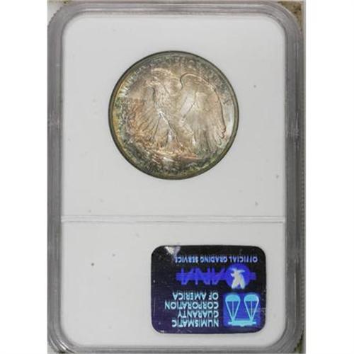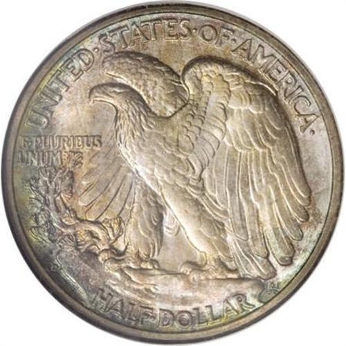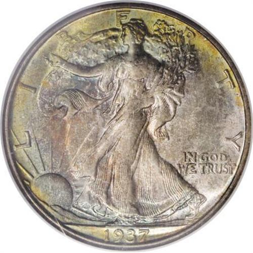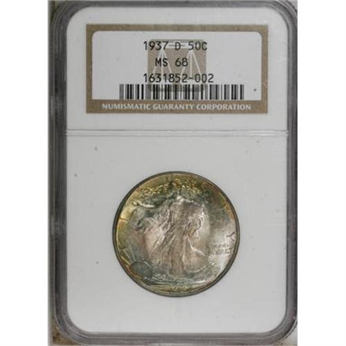 <B>1937-D 50C MS68 NGC.</B></I> Breathtaking toning, above-average detail, and seemingly flawless surfaces converge on this singular representative, one of under 1.7 million pieces struck. Both sides exhibit vivid, loosely concentric bands of lemon-gold, aqua, rouge, and orange around a soft rose center. The softly shimmering, satiny surfaces display only the tiniest of flaws, even under magnification. The zones of highest relief display above-average definition for this often-weak issue, with a degree of detail evident on Liberty's branch hand.<BR> The 1937-D ranks as one of the most challenging later Walking Liberty issues, and this Depression-era beauty in practically unheard-of condition deserves a place in the finest collection. The <I>only</B></I> MS68 example certified by either NGC or PCGS (5/07).<BR><BR><b>Shipping:</b> Coins & Currency (<a target="_blank" href="http://www.heritageauctions.com/common/shipping.php">view shipping information</a>)