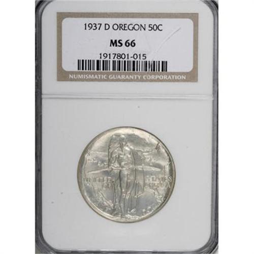 <B>1937-D 50C Oregon MS66 NGC.</B></I> NGC Census: (829/483). PCGS Population (1071/537). Mintage: 12,008. Numismedia Wsl. Price for NGC/PCGS coin in MS66: $356. (#9347)<BR><BR><b>Shipping:</b> Coins & Currency (<a target="_blank" href="http://www.heritageauctions.com/common/shipping.php">view shipping information</a>)