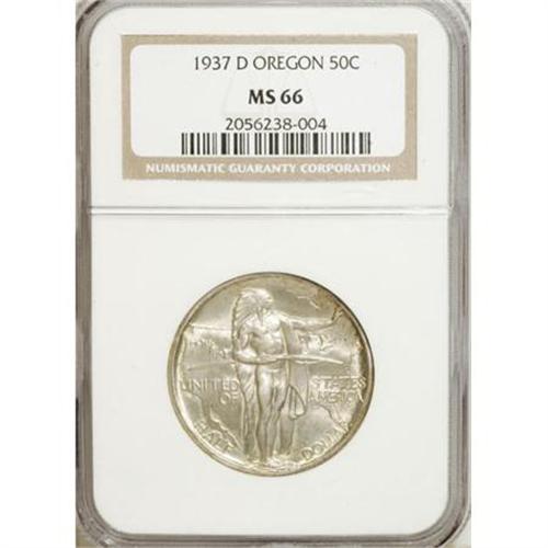 <B>1937-D 50C Oregon MS66 NGC.</B></I> NGC Census: (832/488). PCGS Population (1081/544). Mintage: 12,008. Numismedia Wsl. Price for NGC/PCGS coin in MS66: $356. (#9347)<BR><BR><b>Shipping:</b> Coins & Currency (<a target="_blank" href="http://www.heritageauctions.com/common/shipping.php">view shipping information</a>)