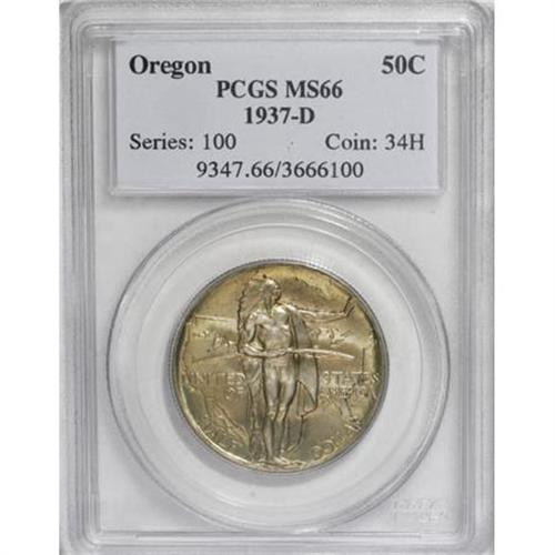 <B>1937-D 50C Oregon MS66 PCGS.</B></I> PCGS Population (1053/528). NGC Census: (819/474). Mintage: 12,008. Numismedia Wsl. Price for NGC/PCGS coin in MS66: $356. (#9347)<BR><BR><b>Shipping:</b> Coins & Currency (<a target="_blank" href="http://www.heritageauctions.com/common/shipping.php">view shipping information</a>\)