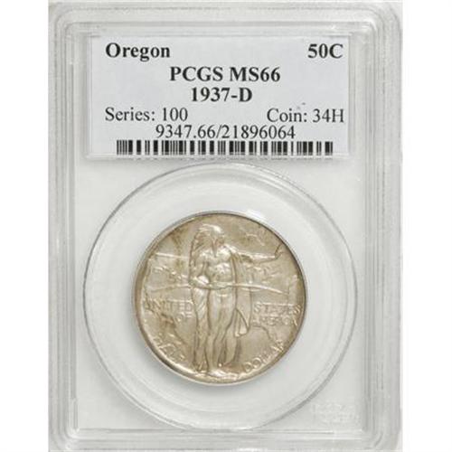 <B>1937-D 50C Oregon MS66 PCGS.</B></I> PCGS Population (1084/545). NGC Census: (834/489). Mintage: 12,008. Numismedia Wsl. Price for NGC/PCGS coin in MS66: $356. (#9347)<BR><BR><b>Shipping:</b> Coins & Currency (<a target="_blank" href="http://www.heritageauctions.com/common/shipping.php">view shipping information</a>)