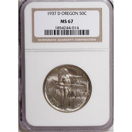 <B>1937-D 50C Oregon MS67 NGC.</B></I> NGC Census: (432/47). PCGS Population (490/38). Mintage: 12,008. Numismedia Wsl. Price for NGC/PCGS coin in MS67: $575. (#9347)<BR><I>From The Frank DuVall Collection of U.S. Commemoratives.</B></I><BR><BR><b>Shipping:</b> Coins & Currency (<a target="_blank" href="http://www.heritageauctions.com/common/shipping.php">view shipping information</a>\)