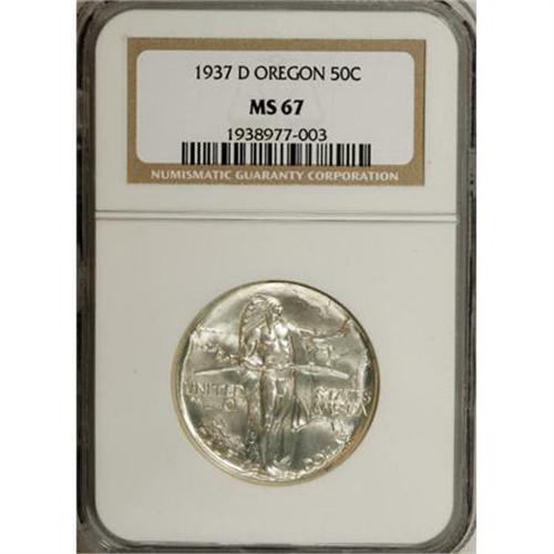 <B>1937-D 50C Oregon MS67 NGC.</B></I> NGC Census: (436/47). PCGS Population (499/39). Mintage: 12,008. Numismedia Wsl. Price for NGC/PCGS coin in MS67: $575. (#9347)<BR><BR><b>Shipping:</b> Coins & Currency (<a target="_blank" href="http://www.heritageauctions.com/common/shipping.php">view shipping information</a>)