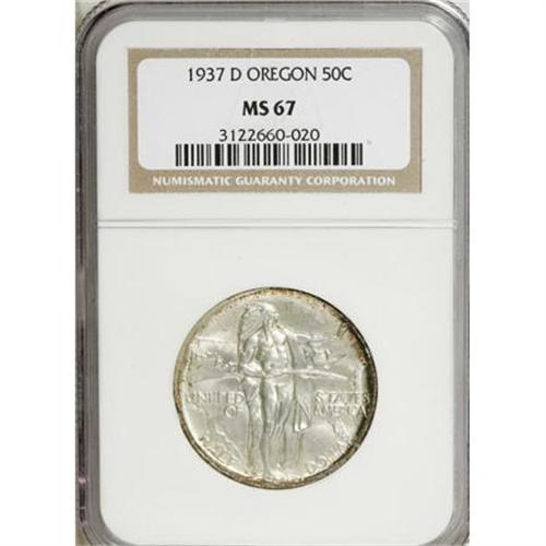 <B>1937-D 50C Oregon MS67 NGC.</B></I> . NGC Census: (453/48). PCGS Population (510/39). Mintage: 12,008. Numismedia Wsl. Price for NGC/PCGS coin in MS67: $575. (#9347)<BR><BR><b>Shipping:</b> Coins & Currency (<a target="_blank" href="http://www.heritageauctions.com/common/shipping.php">view shipping information</a>)