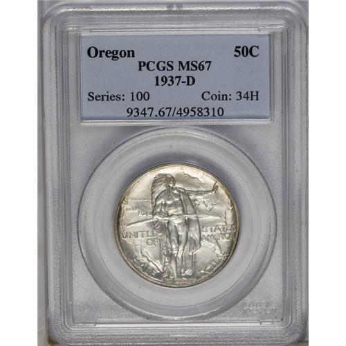 <B>1937-D<50C> Oregon MS67 PCGS.</B></I> A great example of this popular commemorative. A dynamic reverse strike and light olive golden patina are noted on this attractive example.