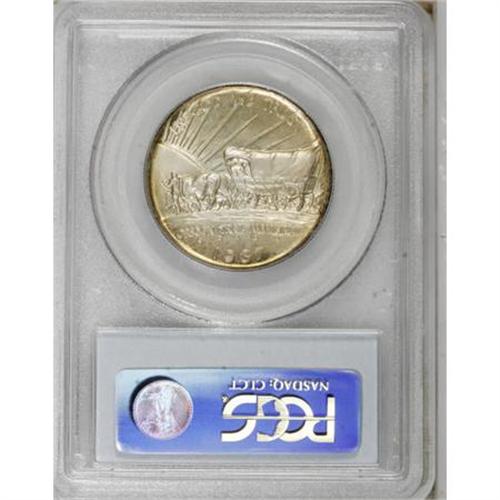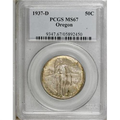 <B>1937-D 50C Oregon MS67 PCGS.</B></I> Elegant luster with just a hint of frost across the devices. The strike is crisp, and silver-gray and golden-tan shadings blend across each side. PCGS has graded 39 finer pieces (1/08).<BR><BR><b>Shipping:</b> Coins & Currency (<a target="_blank" href="http://www.heritageauctions.com/common/shipping.php">view shipping information</a>)