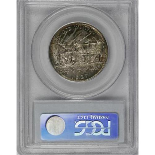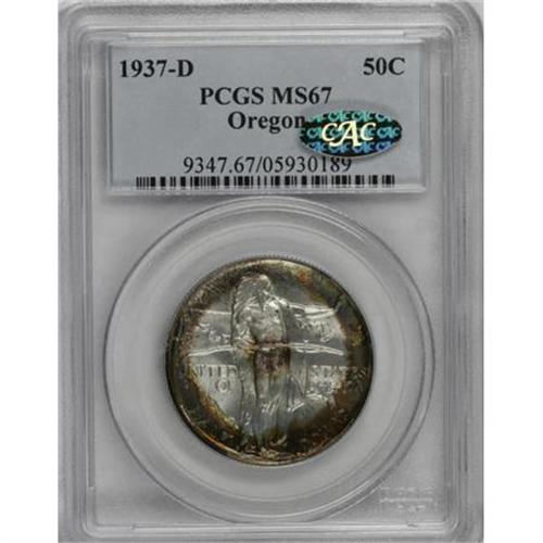 <B>1937-D 50C Oregon MS67 PCGS. CAC Gold Sticker.</B></I> Deep tab toning comprises amber, jade, magenta, and bronze in an outer ring on the obverse, with mottled almond and forest-green toning on the reverse. PCGS has seen only 39 pieces finer (3/08). The gold CAC sticker indicates the coin is a "shot upgrade."<BR><I>From The Good Humor Collection.</B></I><BR><BR><b>Shipping:</b> Coins & Currency (<a target="_blank" href="http://www.heritageauctions.com/common/shipping.php">view shipping information</a>)