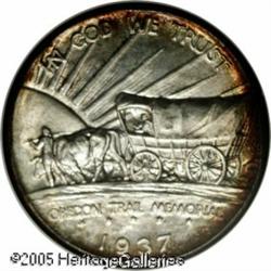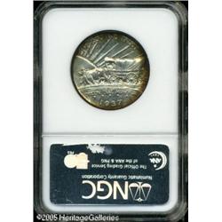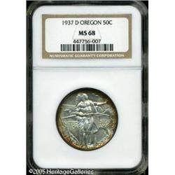 <B>1937-D 50C Oregon MS68 NGC.</B></I> A supremely produced and preserved Oregon that joins near-perfect quality with rich coppery-orange peripheral accents. The '37-D is known to be the most likely issue among the long-lived Oregon Trail Halves to showcase the beautiful design at this lofty level. Population: 41 in 68, 0 finer (1/05). Lot:8552