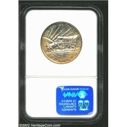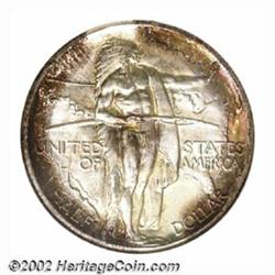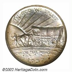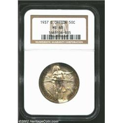 1937-D 50C Oregon MS68 NGC. Essentially "as struck" with surfaces that are nearly perfect and covered with smooth, satiny luster. The untoned portions are pearl-gray, and on the obverse deep russet "tab" toning shows that this coin spent decades in an original cardboard holder of issue. Population: 30 in 68, 0 finer (7/02). Important notice: We expect to be auctioning lots at the rate of 200-250 per hour. Sometimes eBay Premier live bid software cannot keep up with that pace, so we strongly recommend that you place a realistic proxy bid now as insurance to avoid disappointment. Also please note that all Heritage/CAA lots purchased through eBay Premier carry a 20% Buyer's Premium. Please make sure you read the Terms and Conditions.