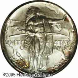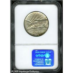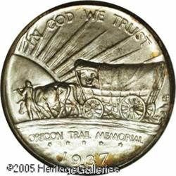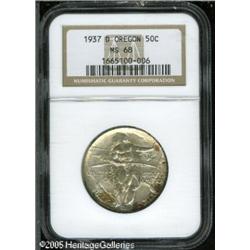 <B>1937-D 50C Oregon MS68 NGC.</B></I> One of several '37-D Oregon Trail commemoratives at this improbable grade level. Intermittent flashes of orange and rose iridescence at the borders draws attention to the almost blemish-free silver-gray surfaces. Lot:8553