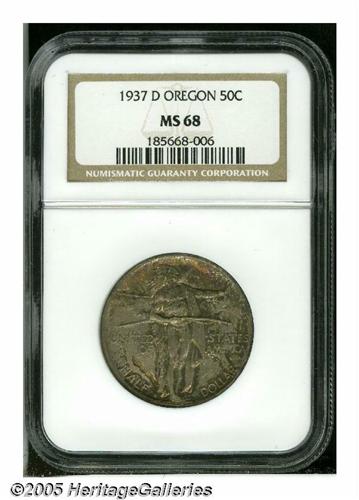 <B>1937-D<50C> Oregon MS68 NGC.</B></I> Waves of lavender, fire-red, apple-green, and gunmetal-gray color endow this fully toned and satiny Superb Gem. Thorough evaluation fails to locate even the faintest contact. A sharply struck and eye appealing example of the popular and long lived Commemorative type.