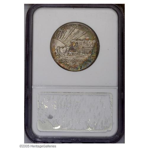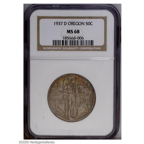 <B>1937-D<50C> Oregon MS68 NGC.</B></I> Waves of lavender, fire-red, apple-green, and gunmetal-gray color endow this fully toned and satiny Superb Gem. Thorough evaluation fails to locate even the faintest contact. A sharply struck and eye appealing example of the popular and long lived Commemorative type. Population: 39 in 68, 1 finer (10/05).