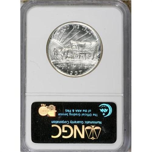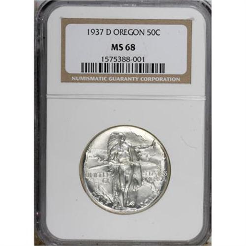 <B>1937-D 50C Oregon MS68 NGC.</B></I> Strongly lustrous with powerful detail, this essentially untoned Oregon is pristine to the unaided eye. Both sides offer magnificent eye appeal. A delightful survivor from an original mintage of just 12,008 pieces.<BR><BR><b>Shipping:</b> Coins & Currency (<a target="_blank" href="http://www.heritageauctions.com/common/shipping.php">view shipping information</a>\)