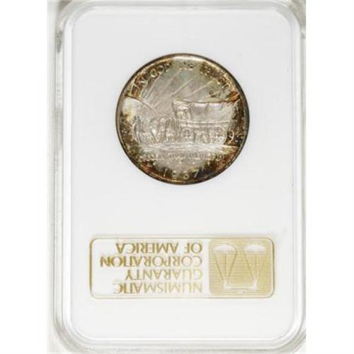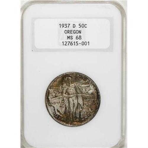 <B>1937-D 50C Oregon MS68 NGC.</B></I> Both sides are beautifully toned in mottled lime-green, russet and champagne-apricot shades that are partially ringed by golden-green and crimson peripheral toning. The strike is well above average for this often poorly impressed D-mint issue, and surface marks are simply nonexistent. Census: 46 in 68, 1 finer (8/07).<BR><BR><b>Shipping:</b> Coins & Currency (<a target="_blank" href="http://www.heritageauctions.com/common/shipping.php">view shipping information</a>)